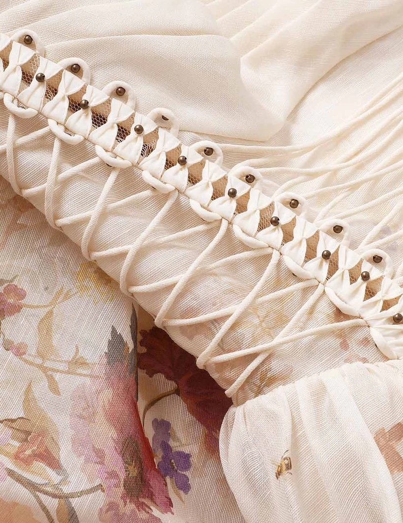 The Alchemy Beaded Mini Dress in Cream Multi Floral from our Spring 2026 Collection, Kindred Spirit. A silk-linen mini dress featuring a fitted corset bodice with ruching, adjustable straps, finished with a full flare skirt and invisible zip closure.